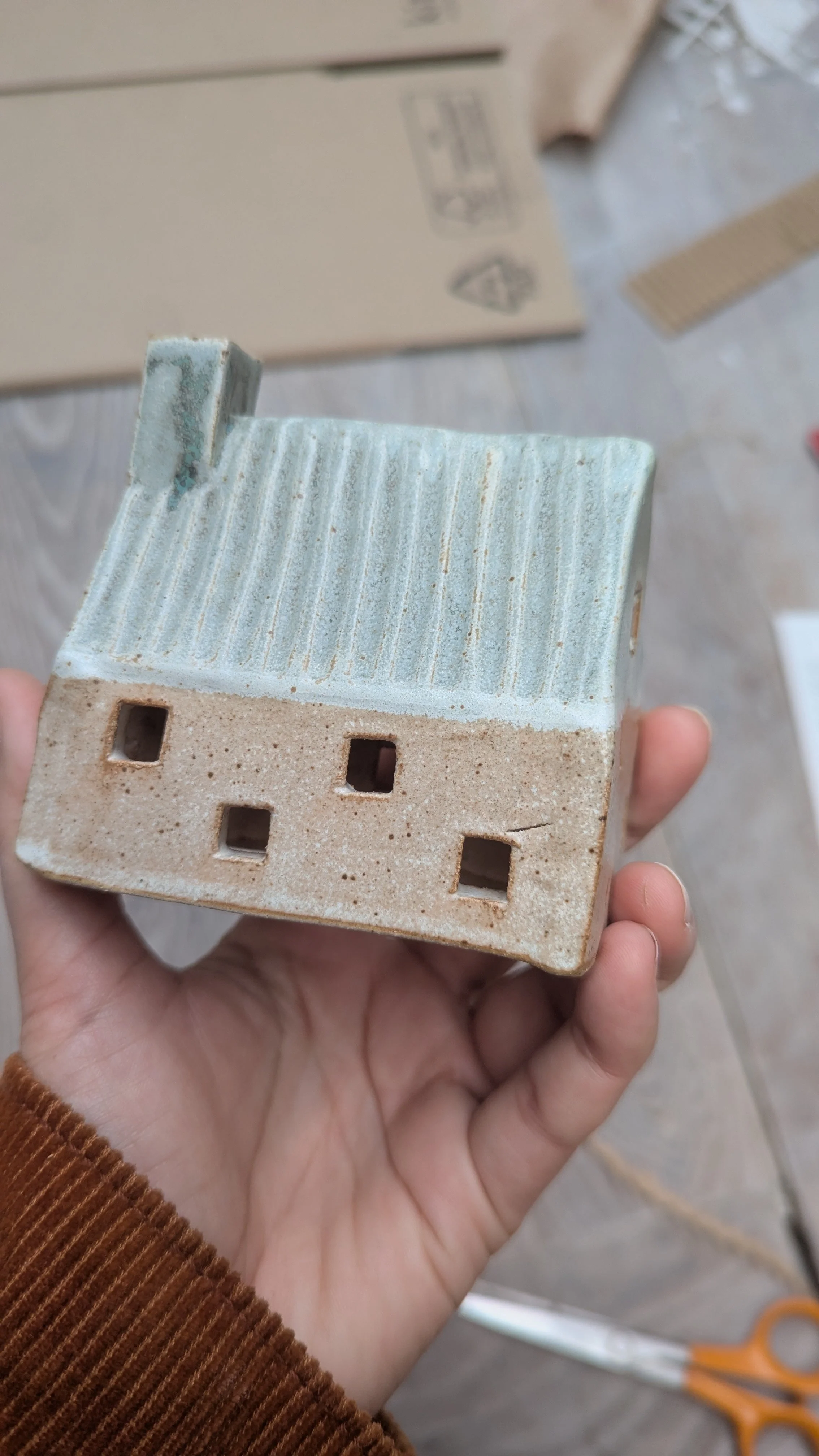 Wheel-thrown little pottery cottage. Indented with my hand-carved pottery stamps. Glazed and gas-fired